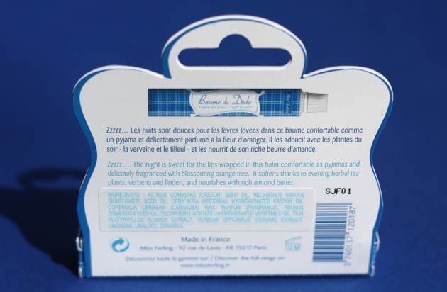 Présenté dans un mignon petit tube, on dirait que lui aussi à revêtu son pyjama ! C’est un soin de nuit pour les lèvres, il aide à les réparer et à entretenir leur douceur. Il est quasi 100% naturel (sauf l’arôme), composé de cires et d’huiles végétales , de beurre d’amande et de verveine et tilleul.