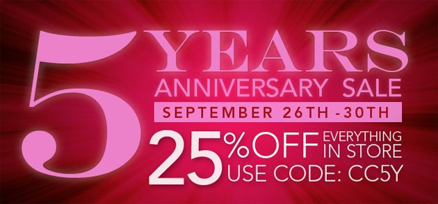 On commence par une très bonne nouvelle ! Ça va être dur de résister, Cherryculture fête des 5 ans et nous offre 25% de réduction dans toute la boutique avec le code : CC5Y! L’offre est valable du 26 au 30 Septembre 2011.